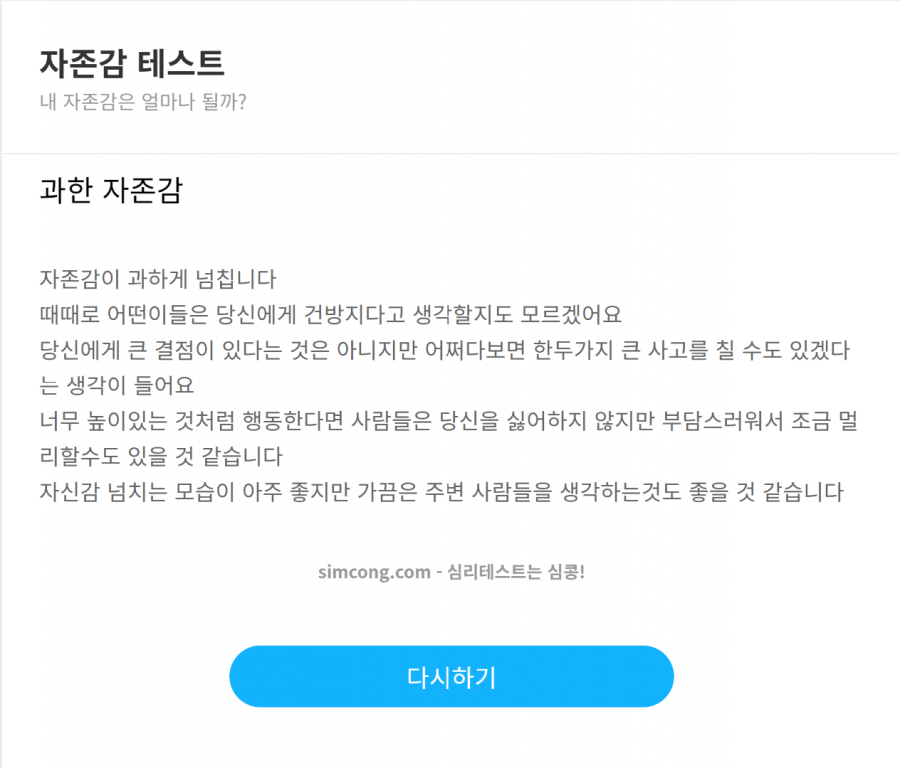 이것도 맞는 듯하다!! 내가 자존감이 높은 편이긴하지만 너무 나대지만 않으면 괜찮다고 생각한다!! 나는 내가 나댄다고 생각은 안하는데 다른 애들은 어떨지 모르겠다! 뭐, 모르겠으면 모르는거지!!
